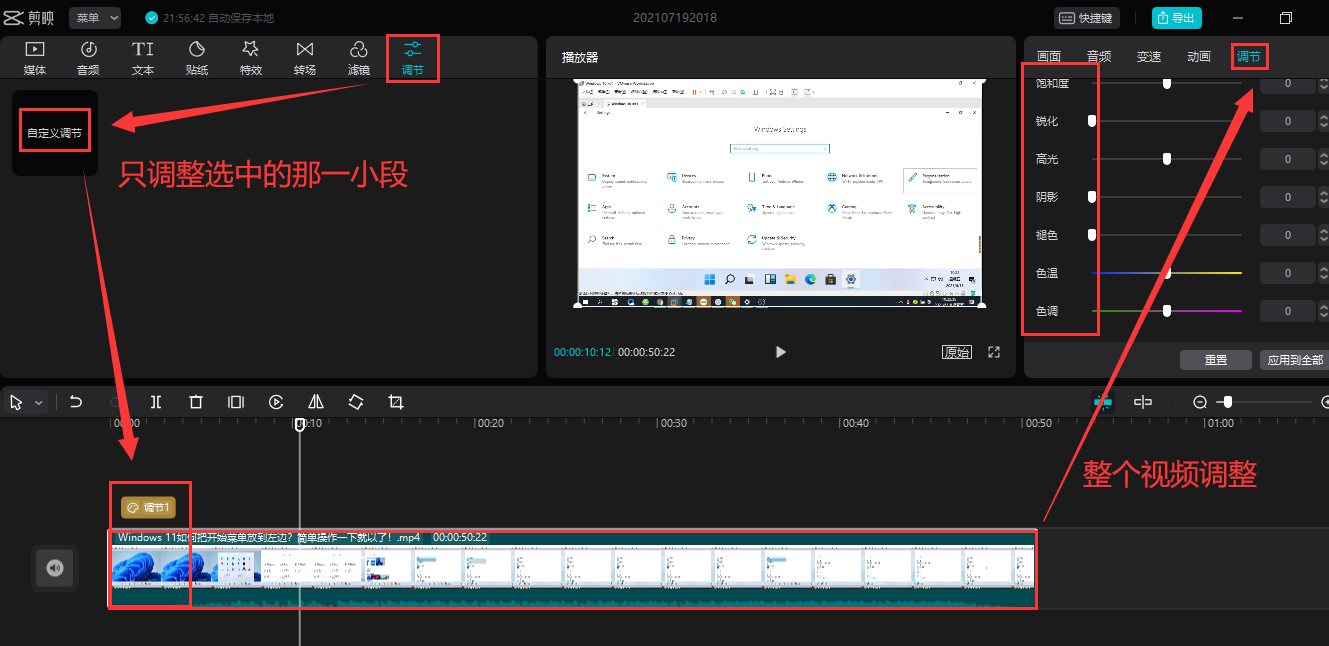 如果只想调节一小部份,可以在调节功能那里点击自定义调节,在时间轴上拉动,你想放到哪就调整哪里。